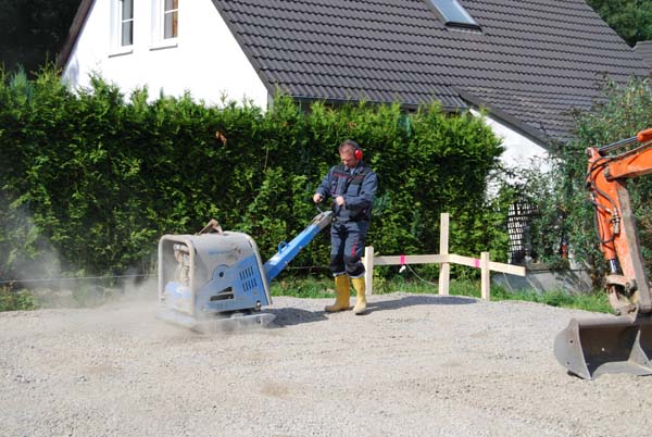 17.09.2008: 6. Bautag: Der Schotter wird immer noch verteilt und verdichtet. Heute kommt auch der erste Teil des Frostschutzes, der ebenfalls verteilt und verdichtet wird.