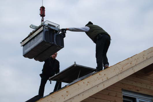 Der Kran hebt die schweren Pakete aufs Dach.
