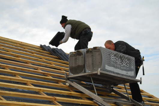 Der Kran legt die Pfannen auf einen Tisch, den man sogar übers Dach rollen kann. Von hier aus werden die Pfannen gleichmäßig verteilt.