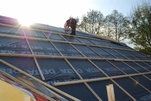 Delta-Folie und Konterlatten sind bereits auf dem Dach - jetzt fehlen nur noch die Dachlatten.