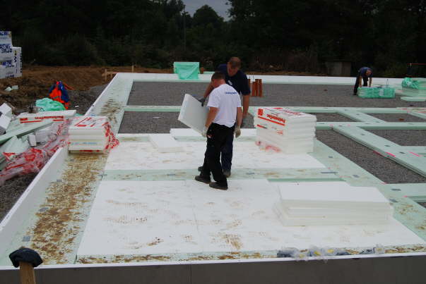 Die Flächen zwischen den druckfesten Dämmstreifen werden mit weißer Perimeter-Dämmung ausgelegt.