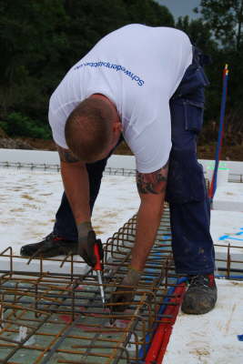 Die einzelnen Stahlkäfige werden mit der Rödelzange und Draht verrödelt, damit sie sich vor dem Betonieren nicht mehr verschieben können.