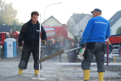 Tom und Dag bringen den Beton ein und nivellieren ihn sofort mit dem Laser.