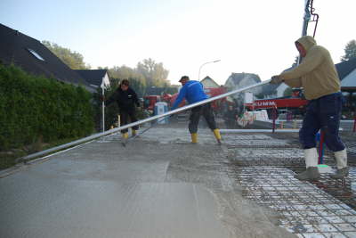 Sofor nach dem Nivellieren, wird der Beton glatt abgezogen.