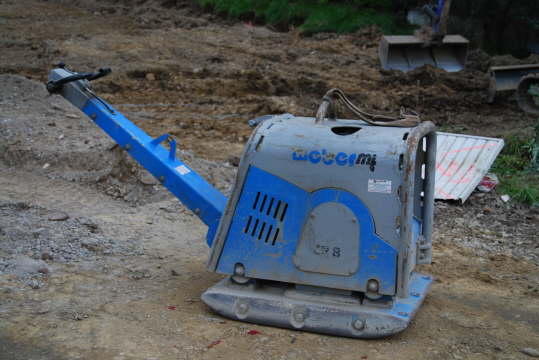 Mit der 550kg-Rüttelplatte wird der Schotter so hoch verdichtet, daß man meint, man hätte eine Betonplatte unter sich.