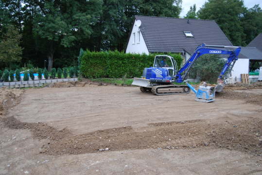Die Baugrube wird mit Recycling-Material aufgefüllt und schichtweise verdichtet.