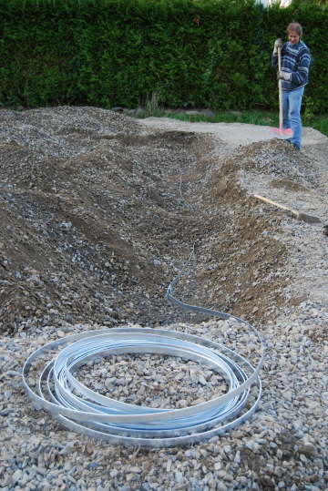 Von der Rolle wird das Erdungsband abgewickelt und in den vorbereiteten Graben gelegt. Raimund im Einsatz.