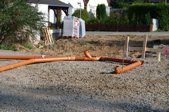 Das Rohr-Wirrwarr wächst. Alles wird genau eingemessen und am Schnurgerüst ausgerichtet.