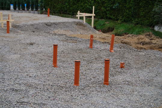 Nur die Endstücke der Rohrleitungen ragen aus dem Boden. Wenn die Platte gegossen ist, sieht man auch hiervon nichts mehr.