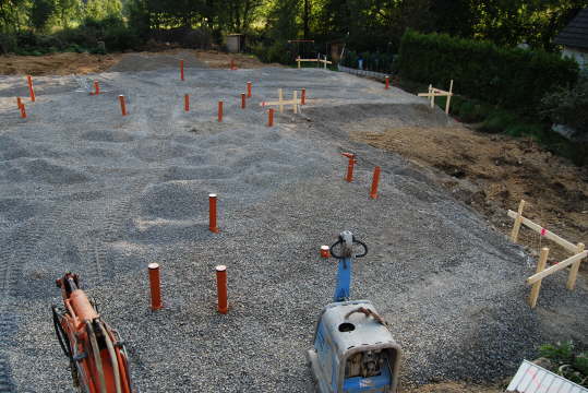Der Split wird grob auf dem Schotter verteilt. Dieser dient als Planum für die Elemente der Bodenplatte.