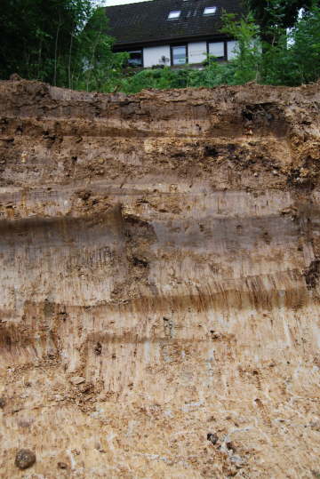 Unten der gut tragende verwitterte Fels, darüber der Lehm, der ausgetauscht werden muß, dann ein alter Boden und darüber noch ein Boden, der irgendwann mal angeschüttet wurde.